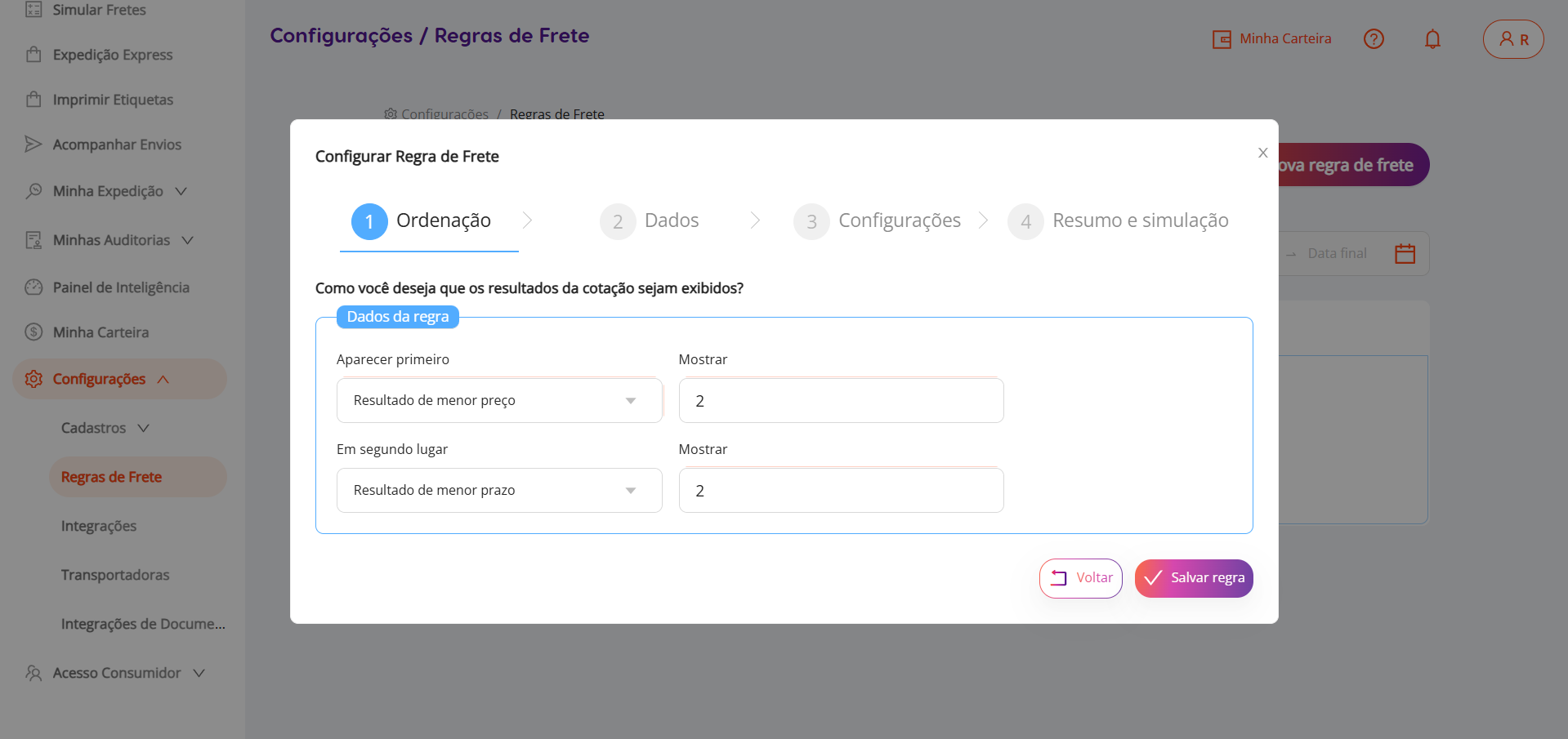 Preencha as informações na aba "Ordenação", escolhendo se deseja que o primeiro resultado seja o de menor preço ou de menor prazo. Você também deve indicar quantos resultados de menor preço e menos prazo deseja que apareçam para o seu cliente final no momento da simulação do frete.
