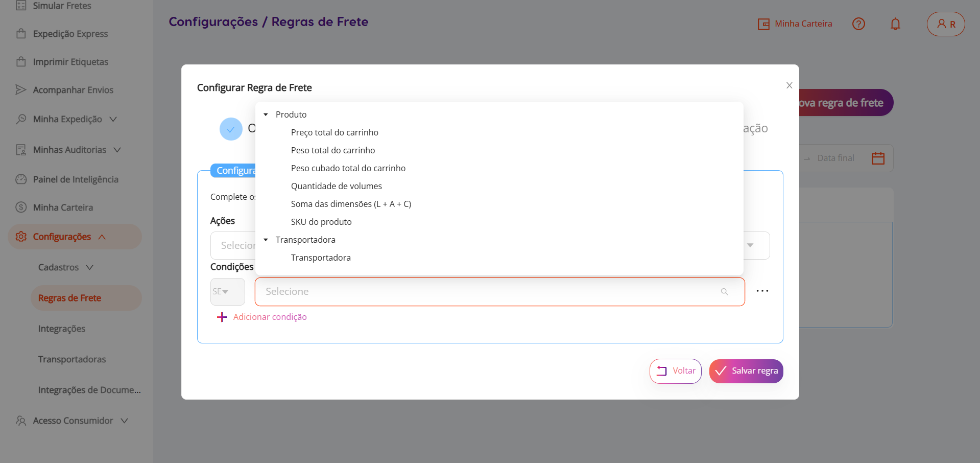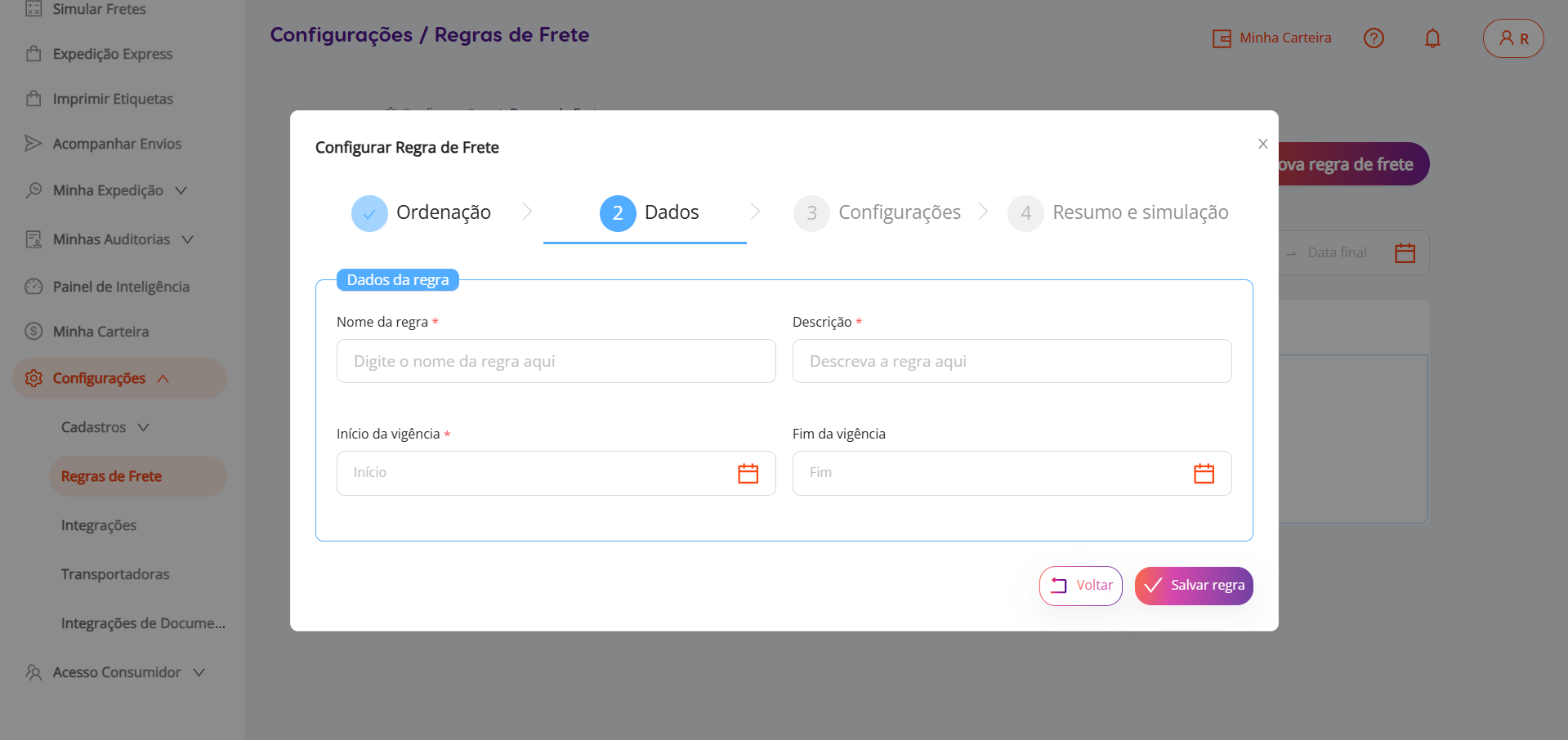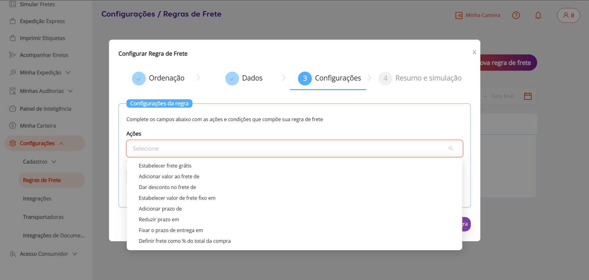 Para conferir se a sua regra foi configurada corretamente, você pode fazer simulações indo no menu principal > simular frete.